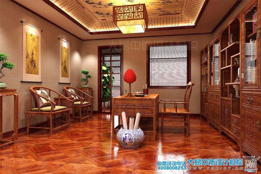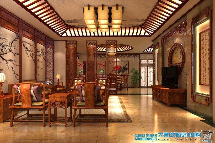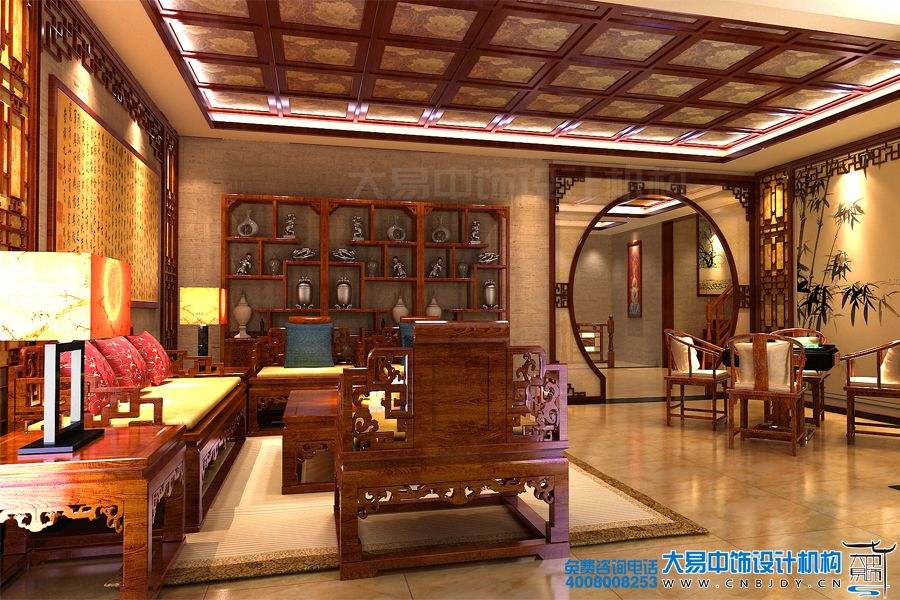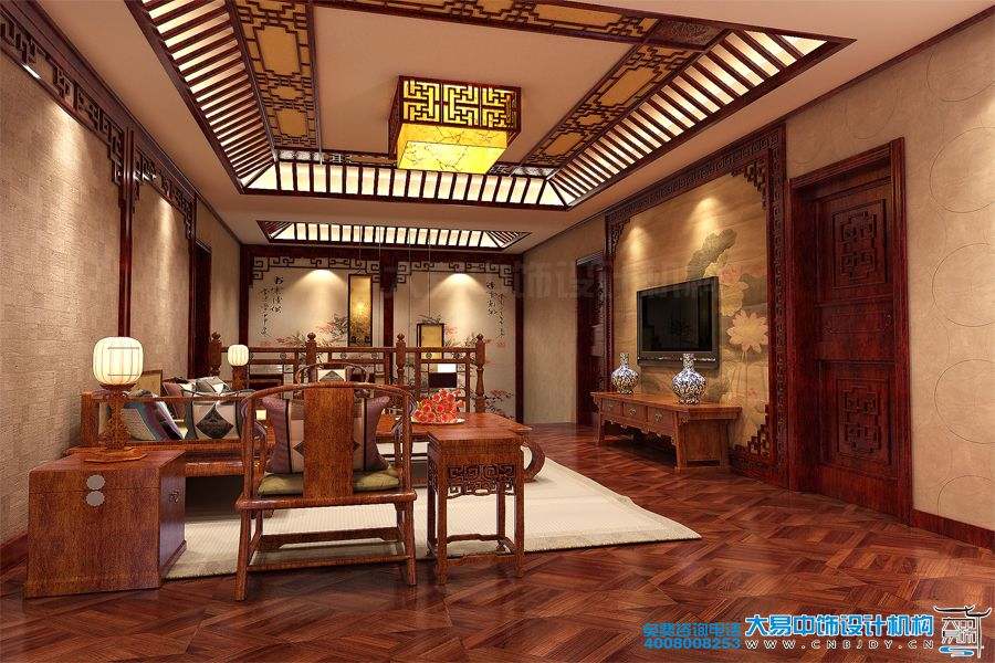 一樓客廳裝飾是會客、娛樂、家庭成員聚談的主要場所,所以設(shè)計的古雅而莊重