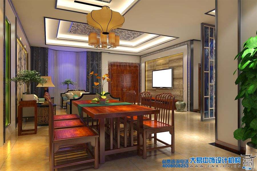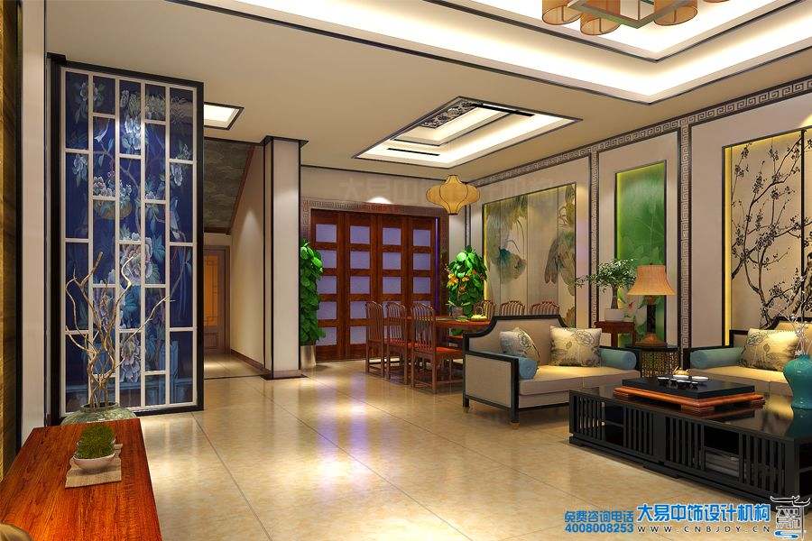 客廳裝飾風(fēng)格凝練,融入大量的傳統(tǒng)飾物與創(chuàng)意木雕畫格,將中式溫婉之風(fēng)彰顯的惟妙惟肖