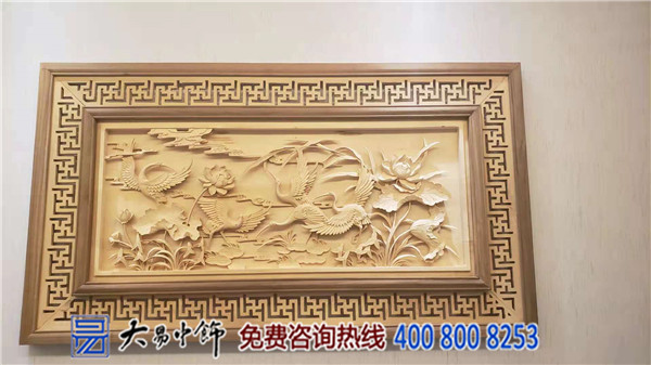 荷鶴美美(和和美美)木雕掛屏,荷諧音“和”;鶴諧音“和”,常見于家庭懸掛。