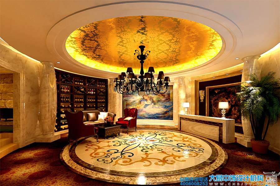 地下室紅酒區(qū)服務(wù)臺(tái)造型富麗大氣,雍容華貴之感,讓人為之震撼