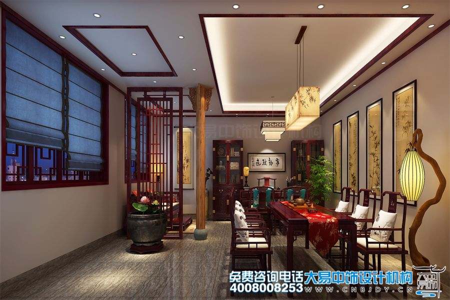 大易中飾在此四合院茶樓中式設計裝修時一改傳統的對稱陳設,八仙桌、中堂、辦公桌、立式書柜以對稱分列,墻面多以畫作增添才情雅韻。木屏將辦公桌與開會區簡單隔開,以木柱石墩頂天立地,,頗具藝術感的根雕吊燈散發出淡淡光影,一盆睡蓮靜靜綻放于此。“一花一世界,一葉一菩提”,蓮心禪韻漸漸暈染開來,彌漫四周。