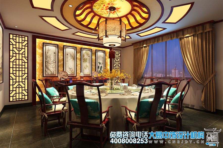 此案例本是餐飲會所中式設計裝修,所以就餐區的裝飾就更為重要。圖中雅間背景墻懸掛“梅蘭竹菊”四君子畫幅,彰顯名士清流的高貴品格,淡泊名利的人格品性。又以金色祥云圖案為底色,傳達中國傳統符號的特色韻味,吉祥美滿、和諧共生。圓形吊頂更是以牡丹圖為飾,圓形宮燈流蘇低垂,與圓形餐桌相互輝映,團團圓圓,和和美美,整體烘托的古風雅韻、色感優美,展示出中式裝飾的富麗與華美。