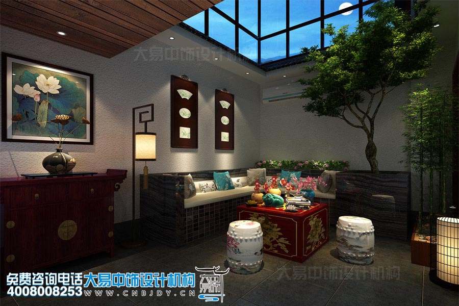 別墅庭院以休閑為主,所以庭院中式設計裝修,更加注重舒適感。靠墻處以磚砌炕榻,沿襲了中國傳統住宅的特色。另留出一方土地,種樹栽竹,給寂寂空庭一抹清幽綠意,一分清高氣節。