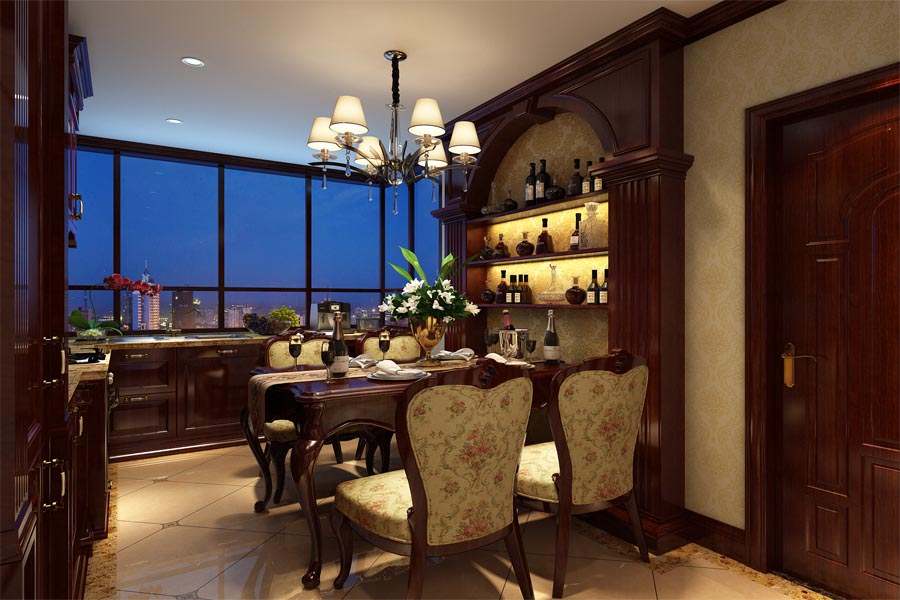 廚房是女人的天下,偏好美式風格的女主人在此堅持了西式廚房設計風格,但選材、色調與整體家居保持了一致性。一體化原木櫥柜、大理石面灶臺,因業主喜好飲酒,在餐廳處又設計了簡單的酒架,供日常小酌。設計筆觸雖簡約卻處處彰顯主人藝術性的審美及高雅的生活情趣。