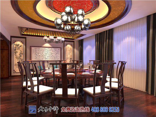 中式餐廳裝修設計首先要有中式元素,凸顯中式風格。本案例中,大易中飾針對不同的包房設計不同的裝修特點。