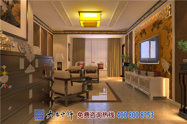 2.仙鶴圖案的沙發(fā)背景墻隔斷,使客廳顯得極具古典韻味,同時,在客廳中劃分出休閑會客區(qū),大氣、整潔的沙發(fā),也符合中式的中規(guī)中矩感,而圓形溫馨的吊燈,則增添了不少時尚感。
