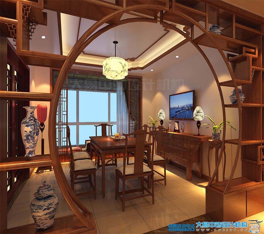 餐廳中式設計裝修,略帶和室風,陽臺的落地窗給予室內極好的光線,加上淺色調搭配,一體化的配置,從軟隔博古架月洞門到電視機條案,木質的清香與紋理徐徐鋪展開來,點綴了餐廳空間的溫馨與韻味。