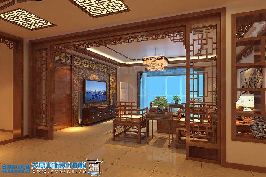 客廳中式設計裝修,木質桌椅的擺設以及精美的花格隔斷陳列與客廳四周,以端莊儒雅之風,展示出傳統家庭文化的獨特魅力。地板選擇米白色瓷磚,與整體家具風格十分相襯,映照出居室和美風范。落地窗讓光線鋪滿室內,整個居室明亮溫馨,給人以家的舒適感。