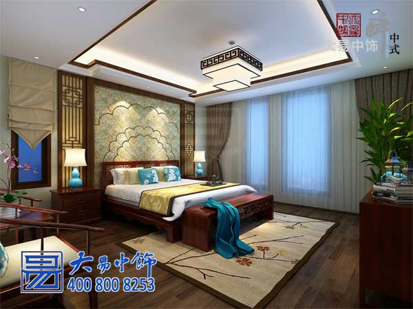 木紋地板盡顯古樸,輕腳慢步無絲毫聲響。床具背景墻用木欄勾畫花邊底紋的中式墻紙,折疊式窗幔低垂下來,將一抹夜色輕輕引進室內。
