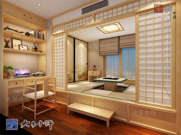 在原有的客臥室空間中式裝修里設置了日式風格的茶室,既可做休閑茶室也可以方便的安排客人居住,方便靈活.很有實用功能。