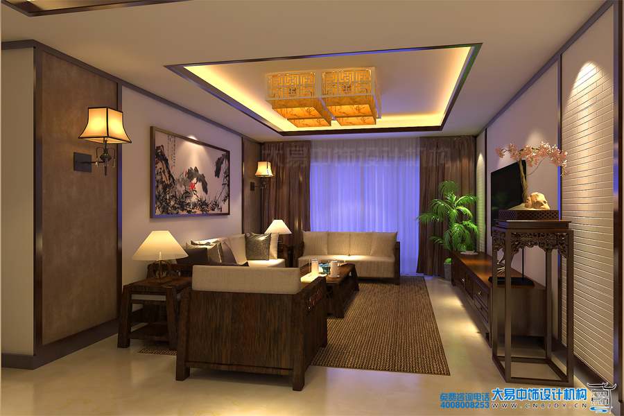 住宅簡約中式設計裝修,墻面以白色為主,正中懸掛一幅畫作,無其他多余裝飾。米黃色花紋地板,在燈光映襯下更顯光潔。棕色實木家具,造型結構簡練大方,落地窗以白紗為襯,窗簾俱選擇棕色,整體環境色調一致,柔和舒適。