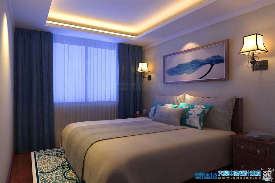 現代簡約中式設計裝修的臥室,以藍、白、原木為主色調。素雅別致,有夢幻浪漫的氛圍。墻面懸一幅藍蓮花畫作,窗簾又以藍白相搭配,相得益彰,意蘊無邊。臥室木質地板搭配純白色的裝飾,床飾簡約,棉麻素色給人以肌膚質感。